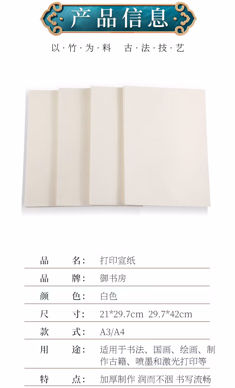 御书房 加厚宣纸打印纸书法字画打印宣纸半生半熟宣纸熟宣打印纸彩墨喷墨激光打印宣纸100张 【白色】熟宣100张 60克加厚打印宣纸【A4】
